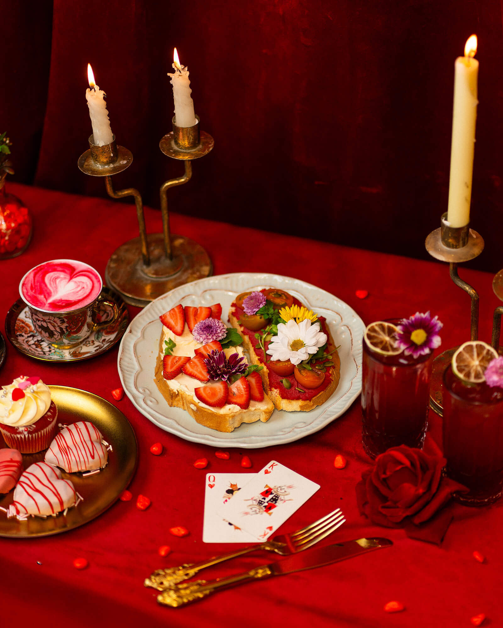 •Tostada de queso crema, frutilla, menta y miel •Tostada de hummus, tomate cherry, berros y semilla de zapallo •3 lingotes en forma de corazón •1 cupcake red velvet •2 limonadas de Jamaica •2 bebidas calientes: leche de chocolate blanco con sabor a frutilla