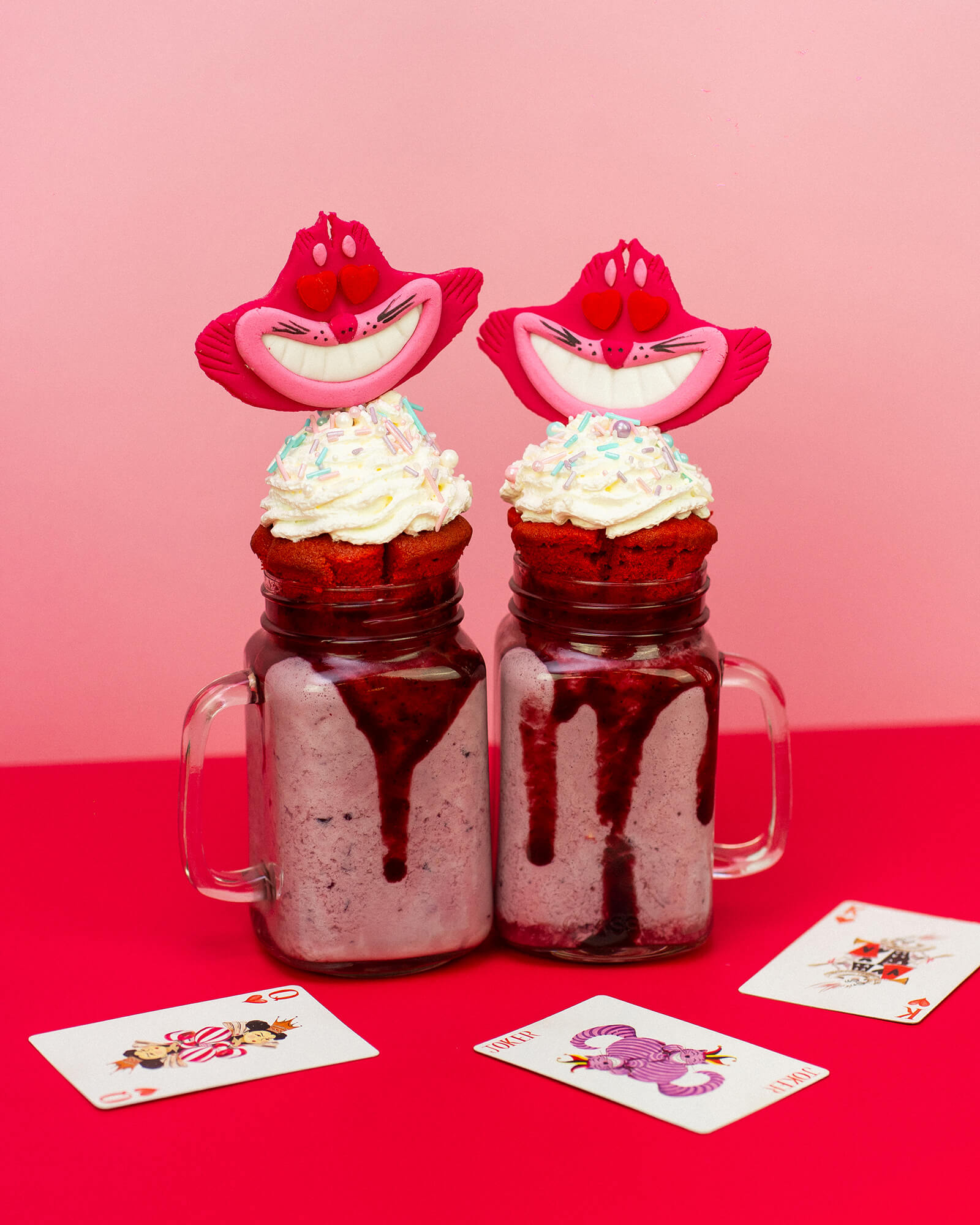 • Precio individual: $11.900 • Precio para dos personas en la misma mesa: $18.900 Malteada de yogurt natural con té rojo y berries congelados. Acompañada de un muffin red velvet y una figura de fondant del gato Cheshire